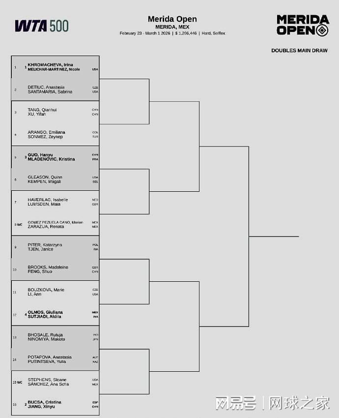 WTA500梅里达站:中国有五朵金花出战双打比赛,分别是汤千慧/徐一璠、郭涵煜/穆拉德诺维奇、丰硕/布鲁克斯、蒋欣玗/布克沙。